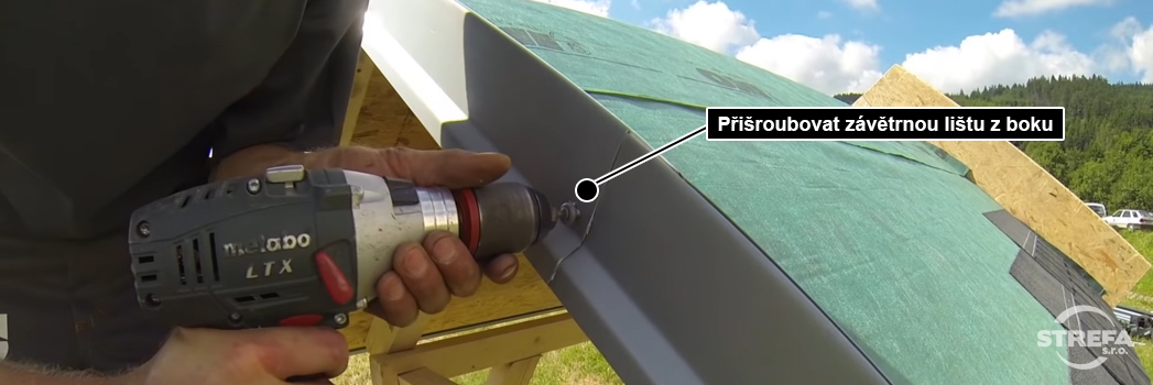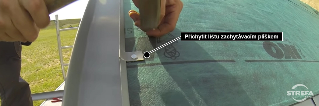 | Samuti on vaja katusekatte all olevalehorisontaalsele pinnale kinnitada lee riba. Selleks kasutatakse torustikukinnitusi, alati 30 cm sammuga. Lipp konksutatakse äravoolutoru serva taha ja naelutatakse paika pappnaagliga. |