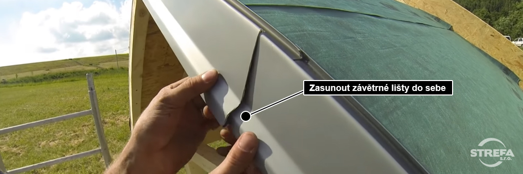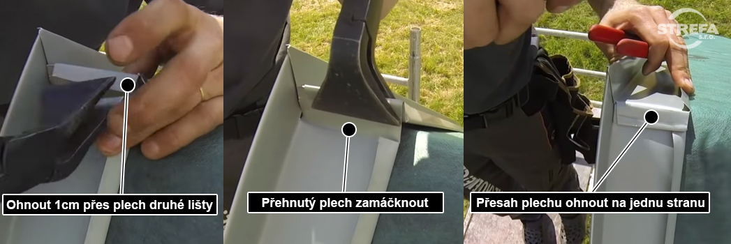 | Viimase sammuna tuleb harja servas olevate rööbaste ühenduskohad kokku voltida. Jagame voltimise kolmeks etapiks: 1) Voldime 1 cm lehe üle teise lati lühema lehe, 2) Voldime kokkuvolditud lehe ümber ja niisutame selle põhjalikult.3) painutame kattuva pleki haamriga ühele poole. |